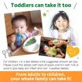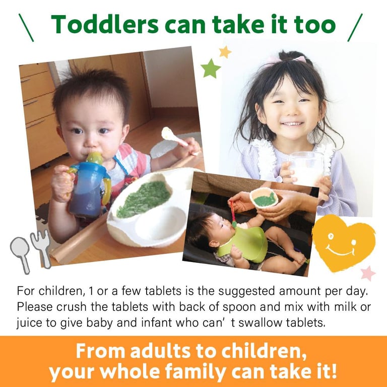 For children, 1 or a few tablets is the suggested amount per day. Please crush the tablets with back of spoon and mix with milk or juice to give baby and infant who can’t swallow tablets.