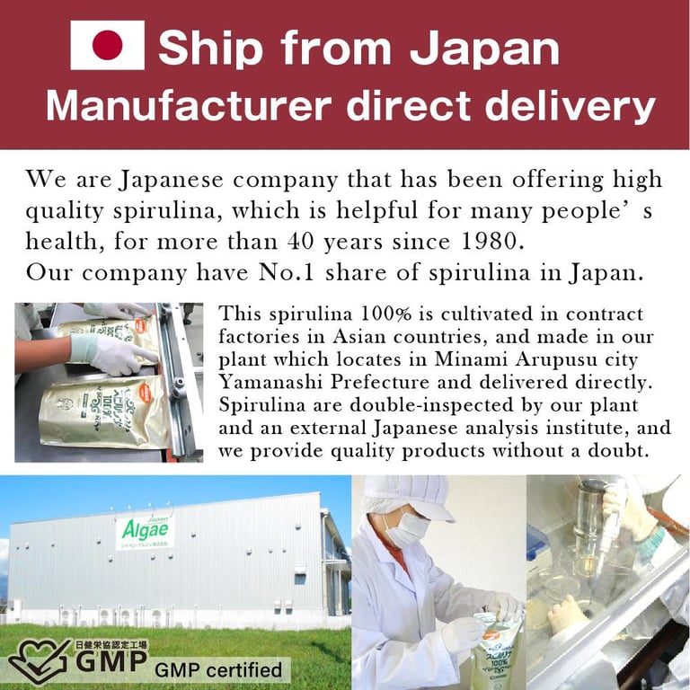 Our plant in Yamanashi prefecture, Japan, manufacture and deliver directly.\nWe always offer high quality of spirulina under the strict control.