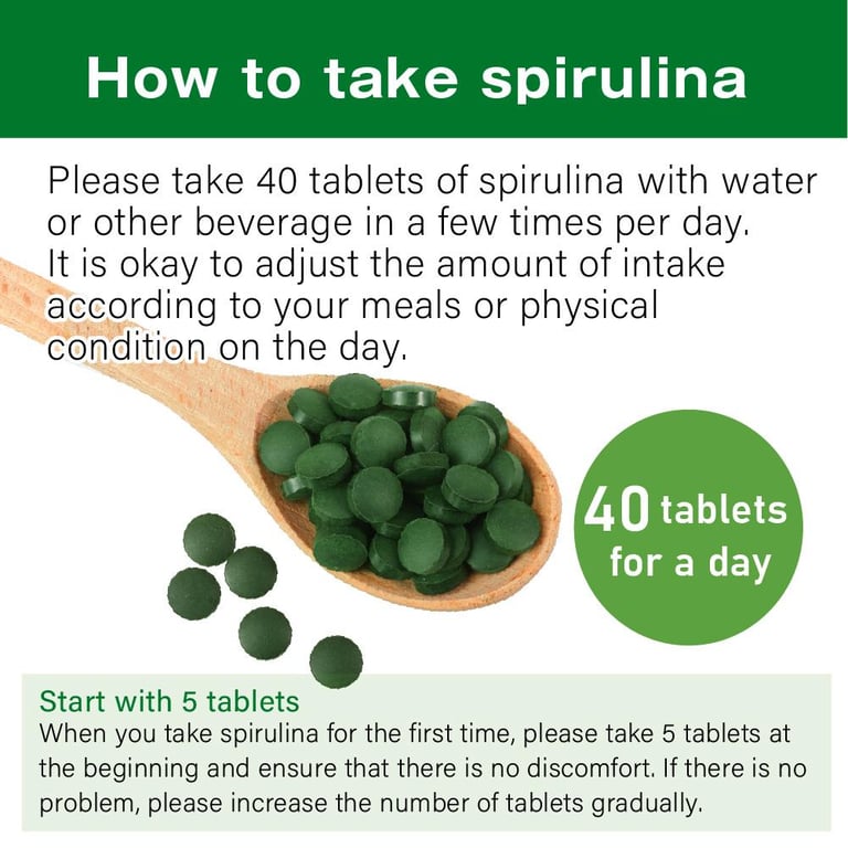 When you take spirulina for the first time, please take 5 tablets at the beginning and ensure that there is no discomfort. If there is no problem, please increase the number of tablets gradually.