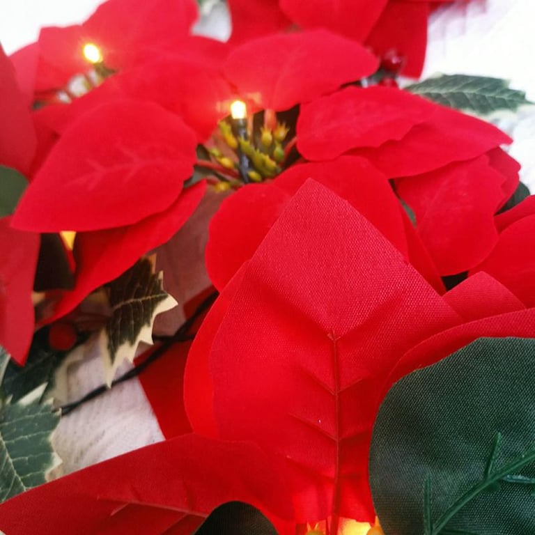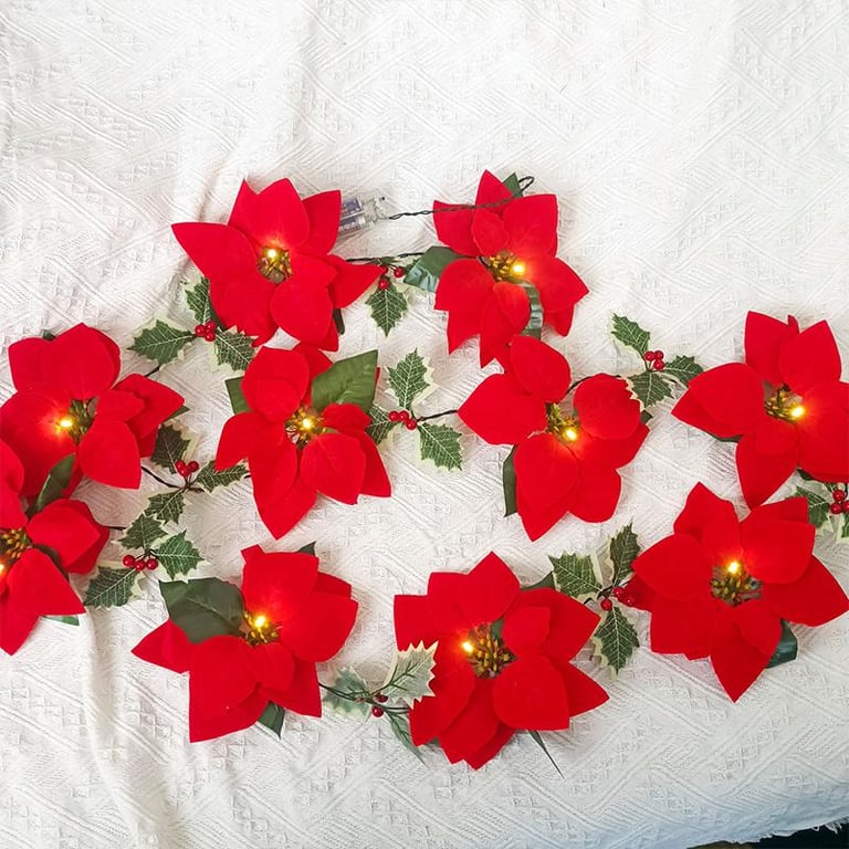 \r\nIt consists of 10 red flowers, 9 of 3 holly berries + 9 green leaves. Used indoors, outdoors, Christmas, weddings, doors, fireplaces, mantelpieces, festivals and dinner parties, as a hanging garland, decorate balconies, gardens, weddings, tables, swing sets, stair railings, restaurants , offices and other places to add atmosphere