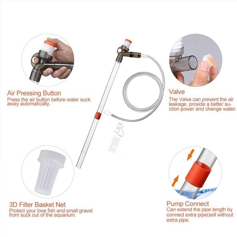 EASY TO USE:Easy operation,easy to install, high quality.If you dont know how to using,pls see the video.Can be used repeatedly, cleaning up necessities in aquarium tools,suitable for various fish tank.Humanized design air - pressing button,When you want to clean and drainage water,first connect the inlet and outlet pipe,then pressing air-pressing button until water comes into the bucket.