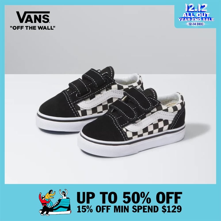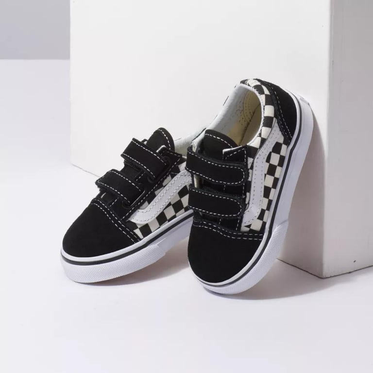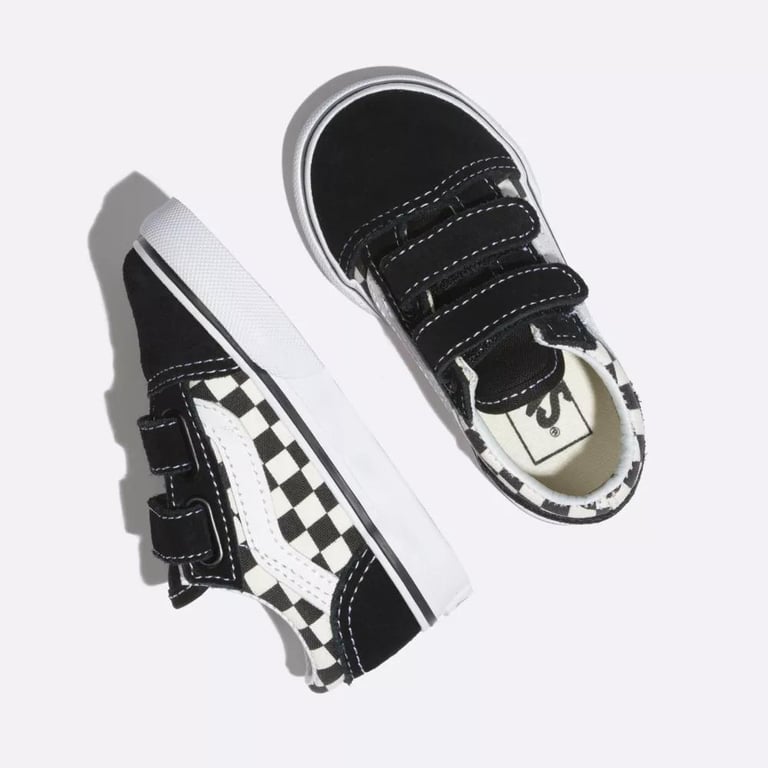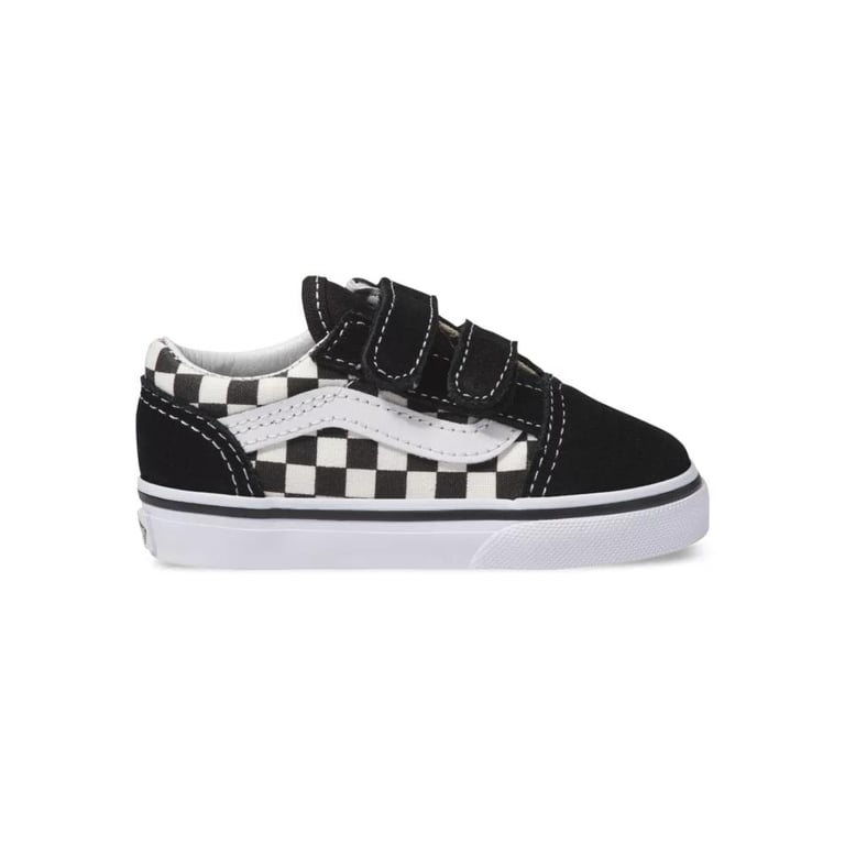 The Primary Check Old Skool V, inspired by the Vans classic skate shoe, features a low profile silhouette with sturdy checkerboard-printed canvas and suede uppers, hook-and-loop closures, padded collars for support and flexibility, and signature rubber waffle outsoles.