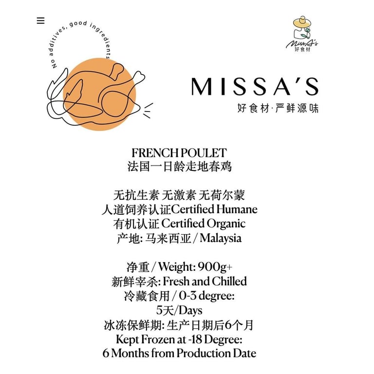 French Poulet 法国-日龄走地春鸡 无添加 无抗生素 无生长激素 自然饲养 产地: 马来西亚/Malaysia 净重 / Weight: 900g 冷藏食用 / 0-3 degree: 5 天/Days 冰冻保鲜期: 生产日期后6个月 Kept Frozen at -18 Degree: 6 Months from Production Date Antibiotic-free, no growth hormones Suitable for roast and other ways of cooking 适合做烤鸡或其他菜肴。 Miss A’s Handpick Fine Food Delivery Schedule: (1) Order paid on Monday to Thursday- Before 4pm —> Next day delivery between 4-7pm- After 4pm —> 2 Days later between 4-7pm (2) Order paid on Friday- Before 4pm —> Saturday delivery between 4-7pm- After 4pm —> Monday delivery between 4-7pm (3) Order paid on Saturday & Sunday —> Delivery on Tuesday between 4-7pm (4) Ordered Paid on Public Holiday —> 2 Days later between 4-7pm * Delivery schedule above reflects Earliest Day of Delivery * We will follow the delivery schedule, unless a later date is requested in the remark after order is placed