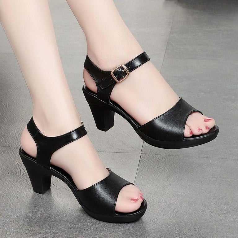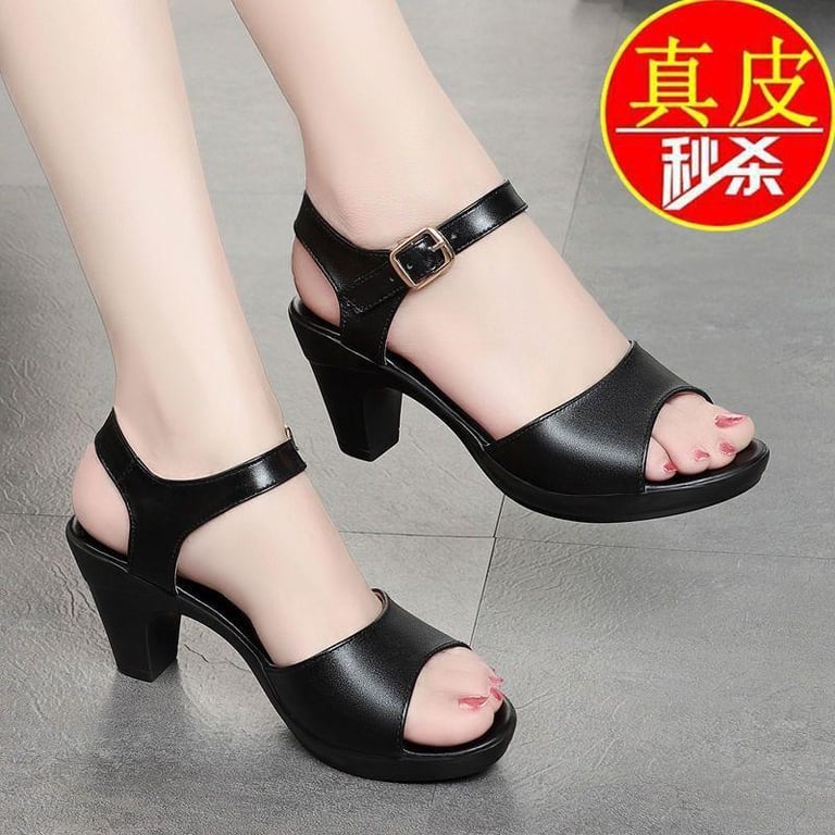 Genuine Leather Mom Sandals Women's 2022 Summer High Heel Chunky Heel Comfortable Fashion New Women's Middle-Aged Women's Shoes