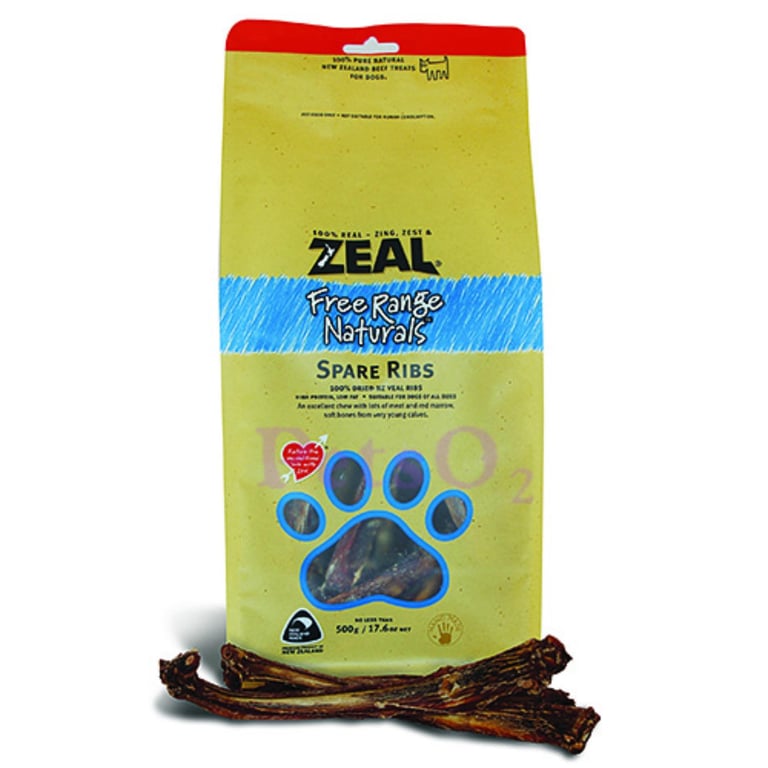 - An excellent chew with lots of meat and red marrow, soft bones from very young calves. One of our best sellers.Gluten Free • Low AllergenHigh Protein • Low FatAnimal protein source: Veal / Free Range BeefMade in New ZealandRecommended for: Dogs of all life stagesNo Vaccines, No Steroids(HGP), No Colouring, No Preservatives, No AdditivesZEAL® 100-percent Pure Natural pet treats are wholesome, trustworthy and traceable to source. We have on offer 21 varieties of delicious treats to choose from, 6 varieties of which cats love too. Our treats are handmade at our Auckland factory from premium New Zealand free range meats and wild caught seafood. Absolutely NO colourings, flavours, additives or preservatives are used in the manufacturing process. Treat your pet with a tasty and healthy source of nutrients. Ingredients: 100-percent Dried New Zealand Veal Ribs