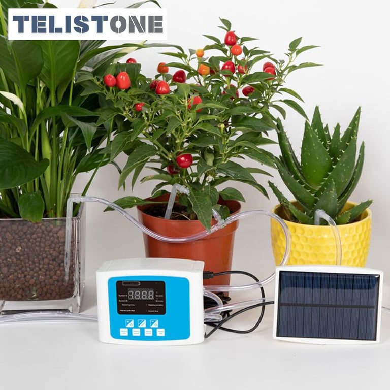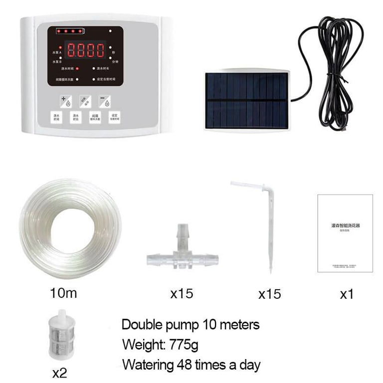 \n2. Complete Accessories - Pump(1pc/2pcs), connectors(10/15/20pcs), hose(10m/20m), ground stakes(10/15/20pcs), and solar panel included to water up to 20 potted plants at a time.