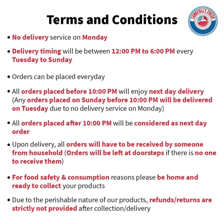 Hong Kong kailan has firm, juicy stems and soft leaves, which makes it a great option for steaming or stir frying. More often than not, kailan can taste sweet if its well cooked and prepared!\n\nDo remember to consume them within 1-2 days though! \n\n\n**Product images are for illustrative purposes only\n\n---- SHIPPING TERMS & CONDITIONS ----\n• No delivery service on Monday\n• Delivery timing will be between 12:00 PM to 6:00 PM every Tuesday to Sunday\n• Orders can be placed everyday\n• All orders placed before 10:00 PM will enjoy next day delivery (Any orders placed on Sunday before 10:00 PM will be delivered on Tuesday due to no delivery service on Monday)\n• All orders placed after 10:00 PM will be considered as next day order\n• Upon delivery, all orders will have to be received by someone from household (Orders will be left at doorsteps if there is no one to receive them)\n• For food safety & consumption reasons please be home and ready to collect your products\n• Due to the perishable nature of our products, refunds/returns are strictly not provided after collection/delivery
