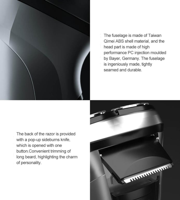 \r\n\r\nThe fuselage is made of Taiwan Qimei abs shell material,and the head prat is made of high performance PC injection moulded by Bayer,Germany,The fuselage is ingeniously made,tightly seamed and durable. The back of the razor is provided with a pop-up sideburns knife,which is opened with one button.Convenient trimming of long beard,highlighting the charm of personality