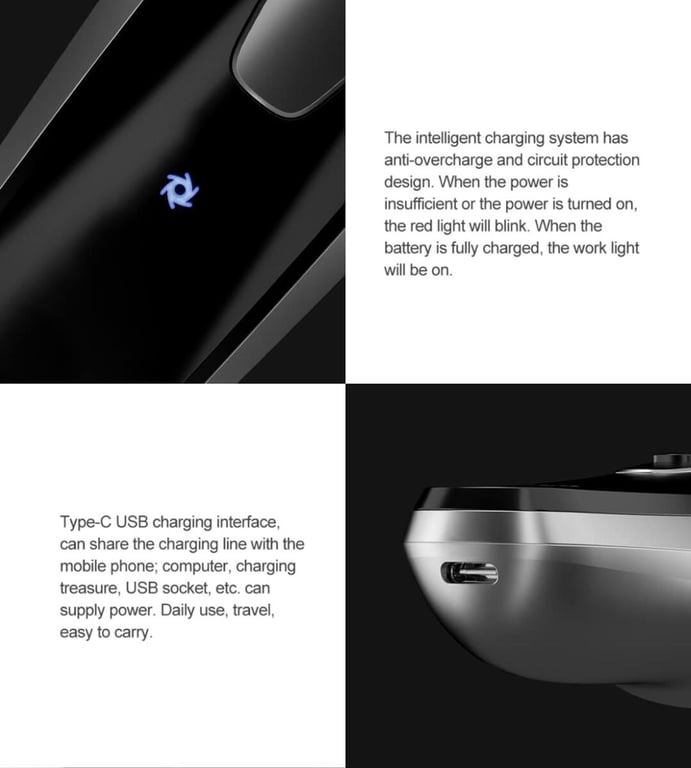 \r\n\r\nThe intelligent charging system has anti-overcharge and circuit protection design.When the power is insufficient or the power is insufficient or the power is turned on the red light will blink.When the battery is fully charged,the work light will be on. Type-C USB charging interface,can share the charging line with the mobile phone;computer;charging treasure,USB socket,etc.can supply power.Daily use,travle,easy to carry