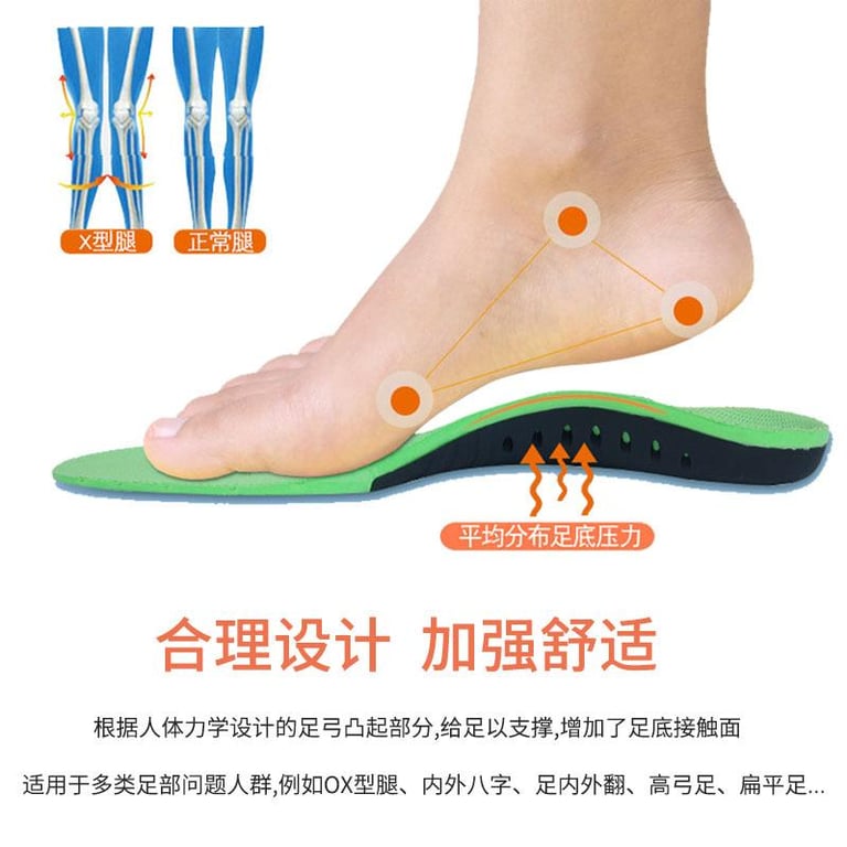 - 3. Arch Height: 1.38inch arch support. 4. U-shaped Heel Design: It can stabilize the heel, effectively help the foot and bones in the movement nomal, and reduce the friction between the feet and the shoes. 5. Three-point Mechanics: Three-point support for the forefoot, arch and heel,make it suitable for people with incorrect walking posture caused by arch pressure and other feet problems. 6. Size: XS / S / M / L / XL