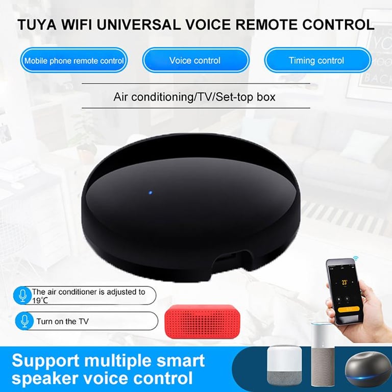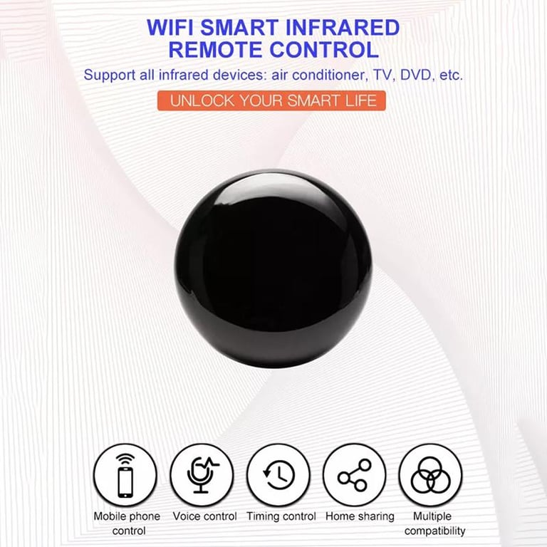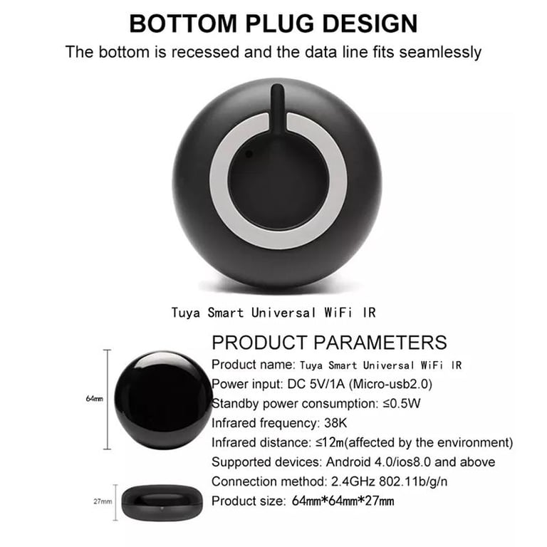 🌐Specification- - Material: ABS-- Input: DC 5V/1A- IR Frequency: 38KHZ- Wifi Frequency: 2.4GHZ (not for 5.0GHz)- Size: 64*64*27mm- Net Weight 30g- Includes micro charging cable- IR Remote Control Distance: 8m- App: TuyaSmart or Smart Life