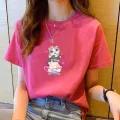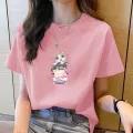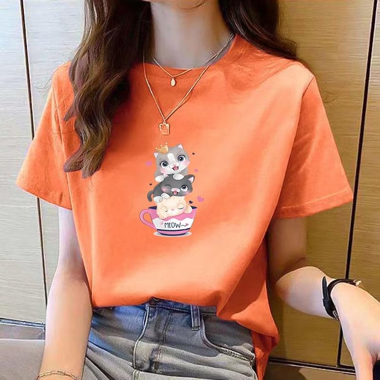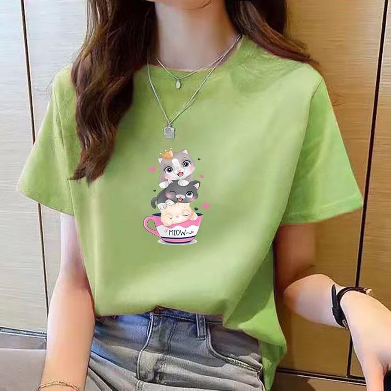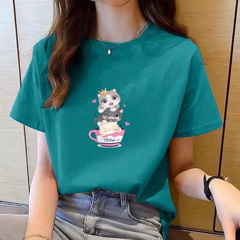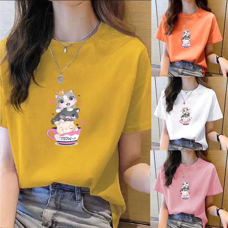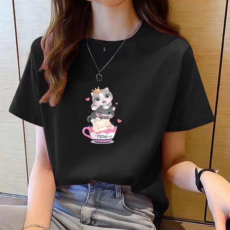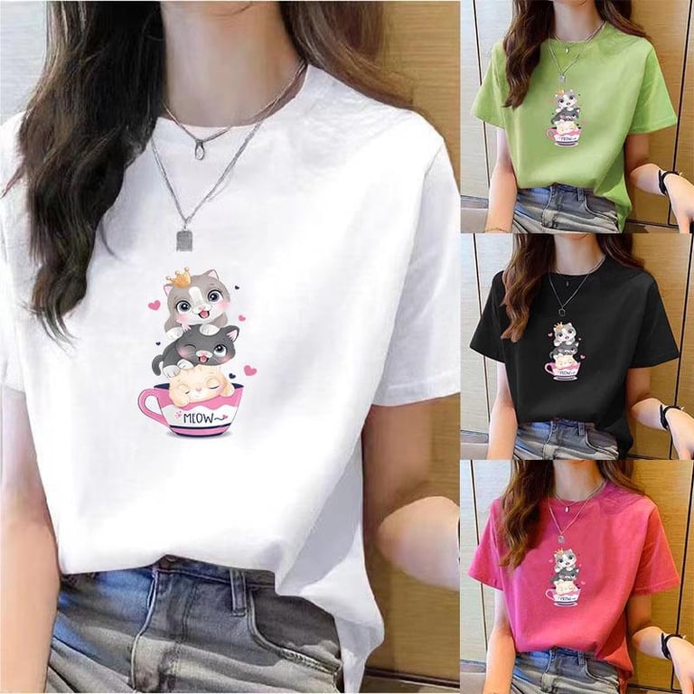 Short Sleeve T-shirt Women Clothing Summer New Cute Kitten Print Round Neck Korean Style T-shirt Summer Girls Clothes Fit Loose Casual Large Size Short Sleeve Top Women