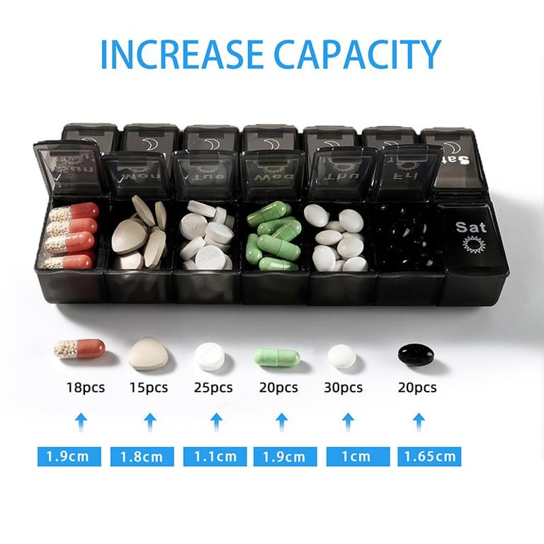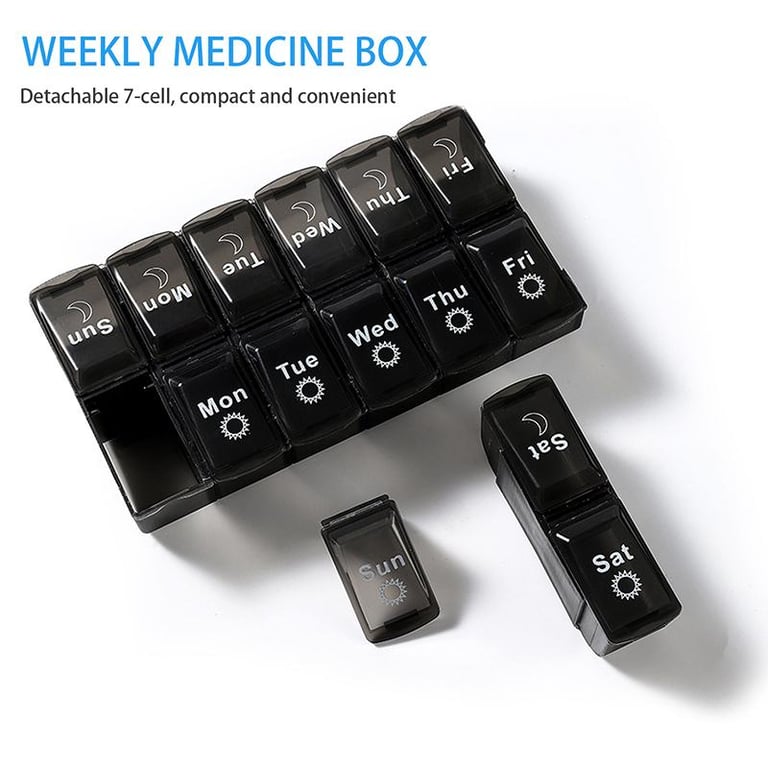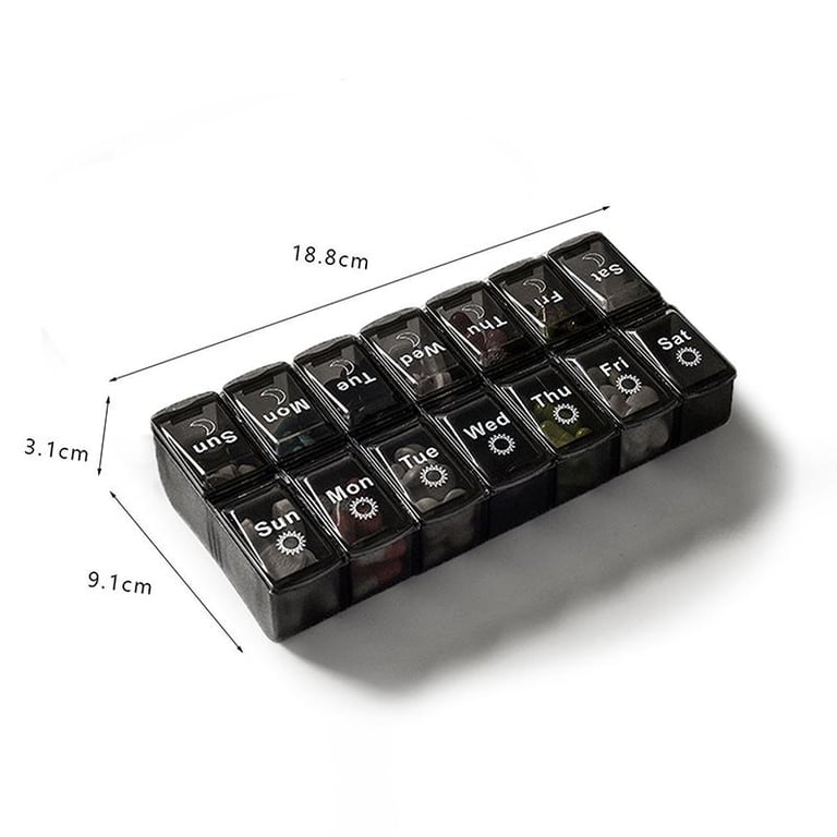7-day planner: This weekly pill box has 7 different medicine positions, 2 for each day of the week. It is an ideal reminder and organizer for the elderly, children and adults. Say goodbye to forgotten or skipped doses and maintain the maximum therapeutic effect!