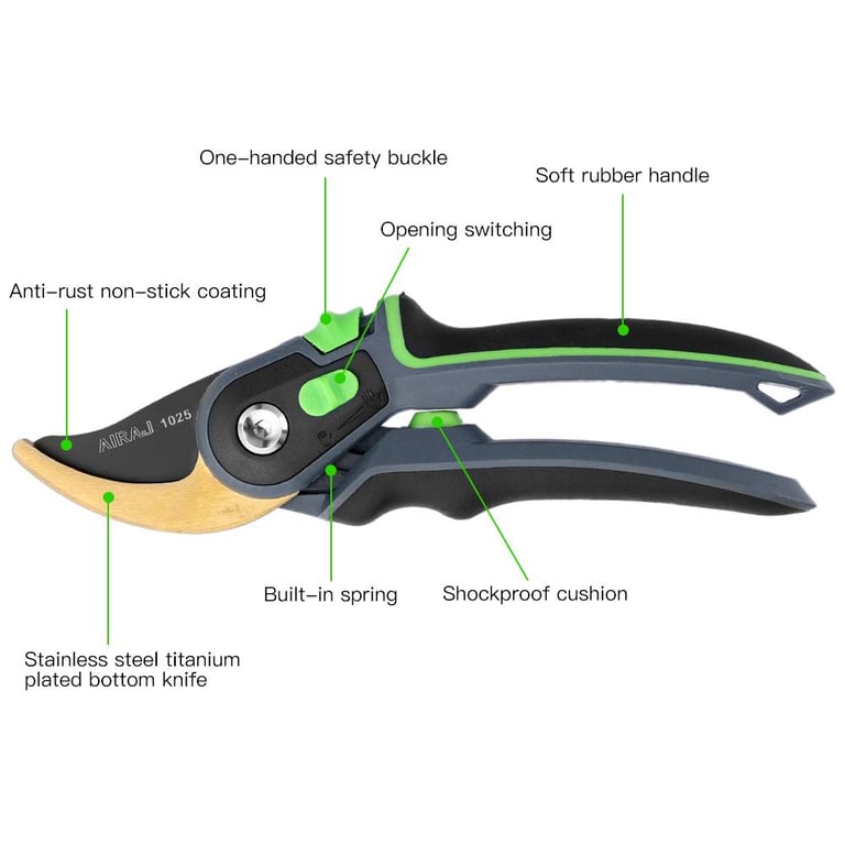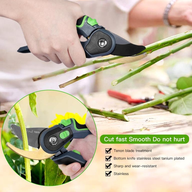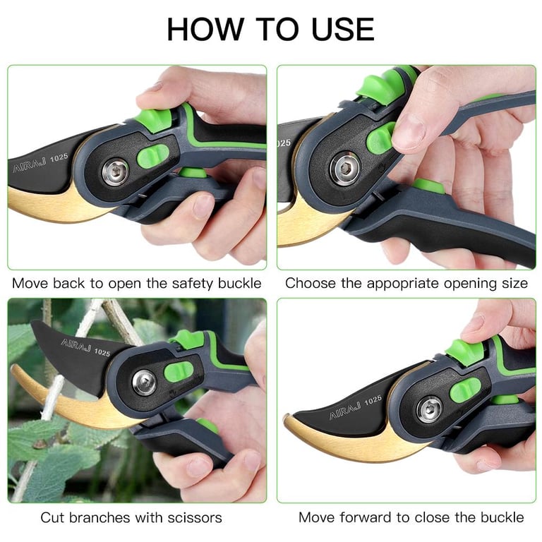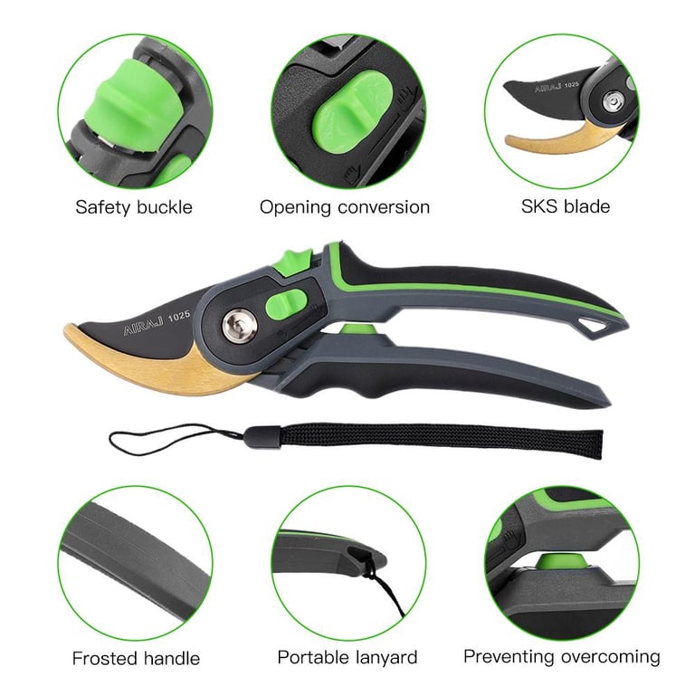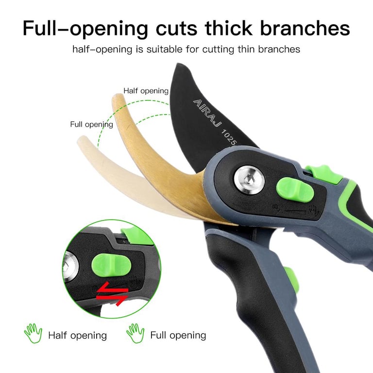 \r\n\r\nRELIABLE: The blades of Gardening Shears adopts professional SK-5 steel, which is ultra-strong, sharp, rust and corrosion resistant. It comes with Non-Slip Handles, strong lightweight with crash pad design, maximum comfort. Double Size adjusting switch could make pruning easier, only one click you can switch between 1/2’’ to 1 inches. Save effort and also meet most different tree branch size needs.