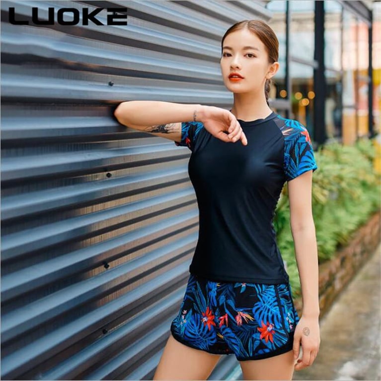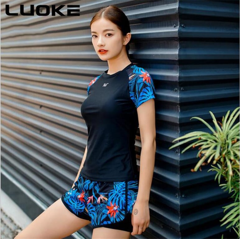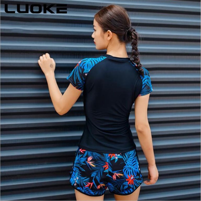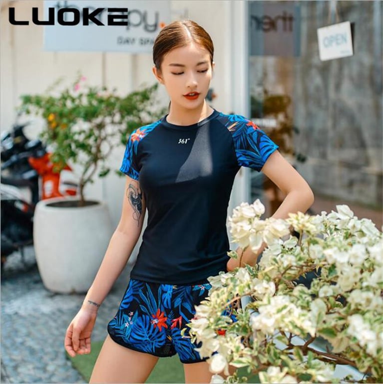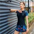 Luoke Swimming Suit Women Free Shipping Conservative Black Short Seeves Pants Swimwear Korean Style Swimming Tops 2Psc Swimming Wear Cover Belly Slimming Swimming Equipment Student's Cute Swimming Suit New