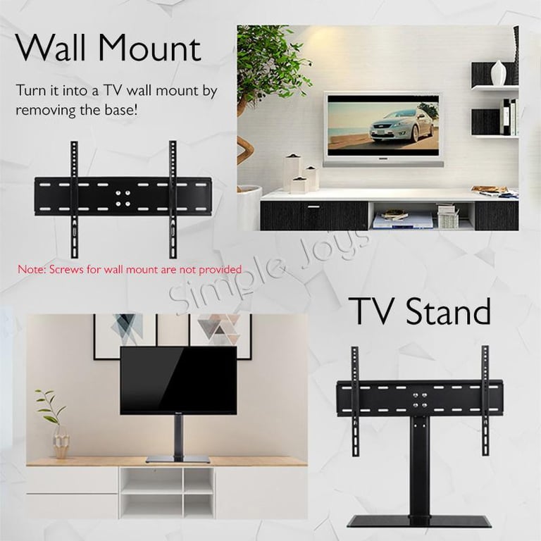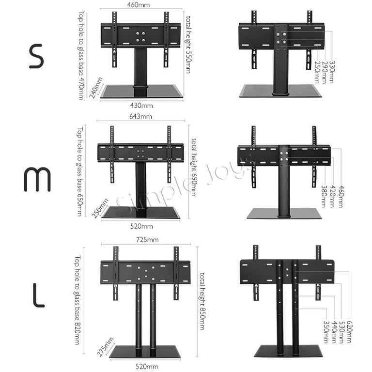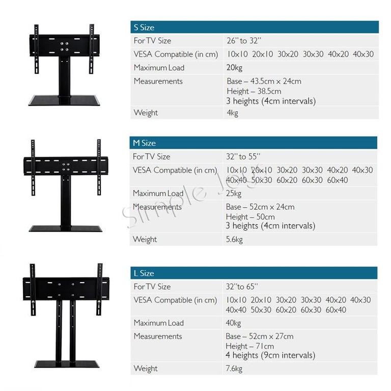 Universal Compatibility - Fits 26"-65" TVs with VESA (mounting hole pattern) from 100x100 mm to 600x400mm. Please note different sizes support different TV sizes and VESAs.