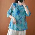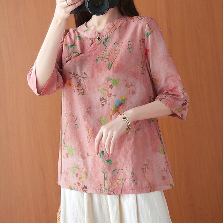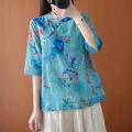 Women's Cotton and Linen Shirt with Chinese-Style Crossbody Buckle Summer Loose Half Sleeve Linen Cheongsam Shirt Top Zen Tea Clothes