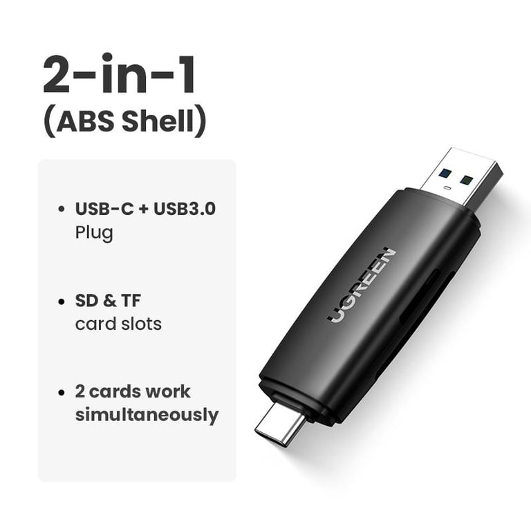 - USB C & USB A 2 in 1 Design: This UGREEN USB SD Card Reader is equipped with a USB 3.0 and type-c slots, which can support most devices with USB A, USB C, and thunderbolt 3 ports. So you can use it on different devices like PCs, Laptops, Tablets, or Smartphones. Say goodbye to the trouble of using multiple card readers. (Note: Only support USB C phones/tablets with OTG function.)