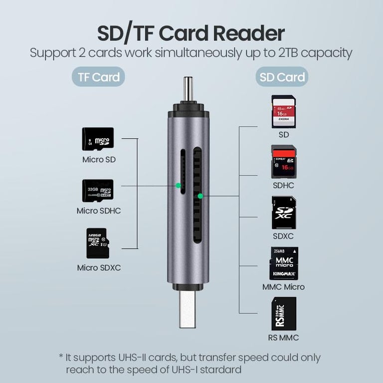 - Universal Compatibility: This UGREEN SD card Reader can plug and play on Windows 11 / 10 / 8.1 / 8 / 7 / XP / Vista, Mac OS, Linux, Chrome OS, iPadOS, Android, etc. And it supports SD / SDXC / SDHX / MMC / RS-MMC / Micro SD (TF)/ Micro SDHC / Micro SDXC / UHS-I memory cards from smart TV, mobile phones, sat-nav, PS4, Xbox, Camera, etc. (Note: This SD card reader will read UHS-II cards at UHS-I speed.)
