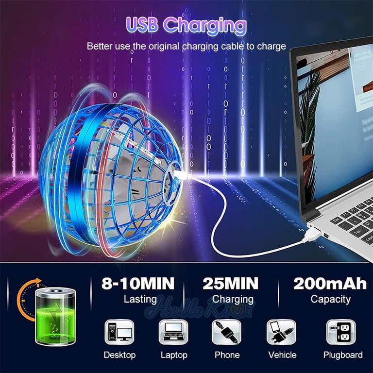 - Rechargeable And Portable: Power the fly space orb up by USB cable for 25 minutes to get fully charged and a single charge will give you a full 8-10 minutes of tricked out flight time.