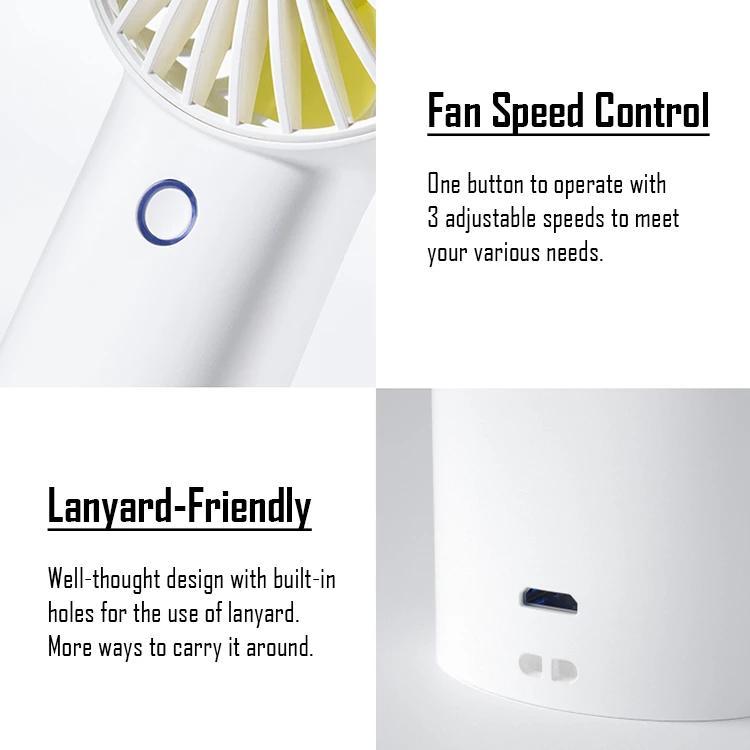 FAST CHARGE AND ONE-KEY OPERATION — Fans gets charged in 3 hours only while other similar fans need 6 hours. The battery of this fan has been designed for the current input of 2A (others 1 A), which makes it get charged faster. Besides, It is easy to use this mini battery fan with only one button. Short press the button to turn on the fan, and press repeatedly to adjust the wind speed or turn off the fan.