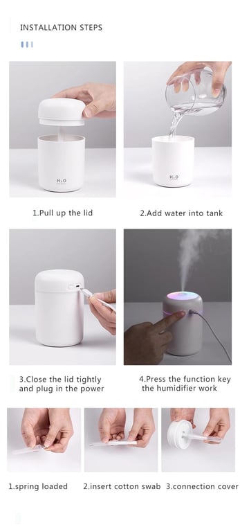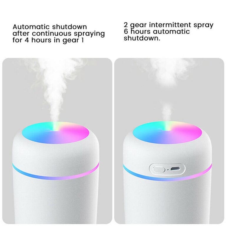 - * Colorful LED rotating lights* Mini size but large capacity, can add about 300ml of water, can be used for spraying for more than 6 hours* Powered by USB charging cable, easy to use in any scene* With continuous spray and intermittent spray modes* With automatic shutdown function, automatic shutdown after 4 hours of continuous spraying, automatic shutdown after 6 hours of intermittent spraying* 45ml / h heavy fog, suitable for bedroom / office / car* Silent spray without any noise* Can add a small amount of essential oil (1-2 drops)