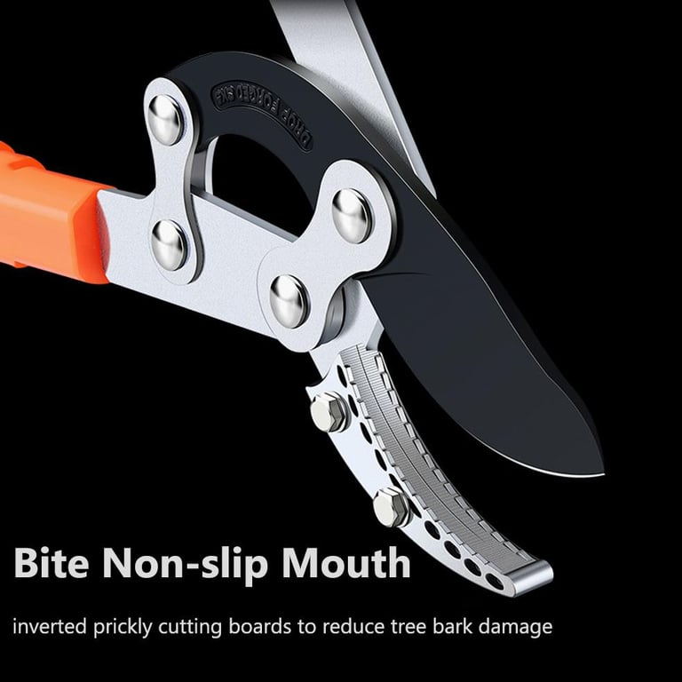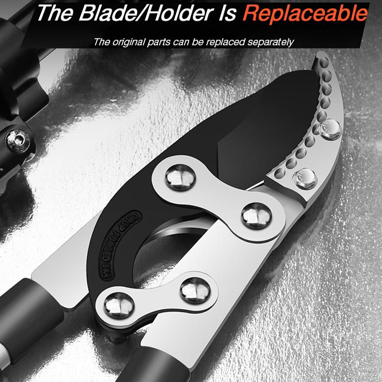 Characteristic: 1. Shark blade design, imported SK-5 blade, surface Teflon treatment 2. Large opening, easy to cut, strong and sharp, stronger cutting, more convenient operation 3. Inverted hook design, stable branch 4.6 gear can expand freely, and the aluminum alloy connecting rod is more portable