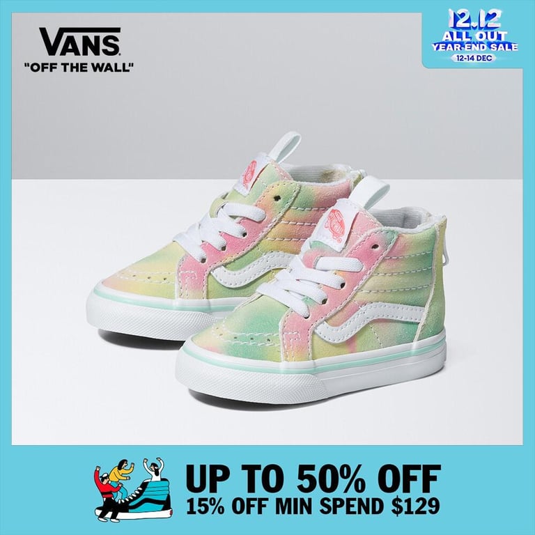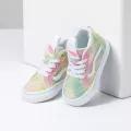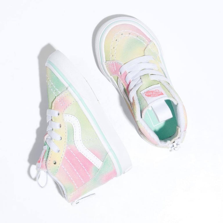 The Rainbow Suede Toddler Sk8-Hi Zip combines the legendary Vans lace-up high top with a zipper entry at the heel, providing increased access and versatility. Along with durable suede uppers featuring an allover rainbow sherbet wash, this classic sidestripe style comes equipped with supportive padded collars, reinforced toe caps, and signature rubber waffle outsoles.