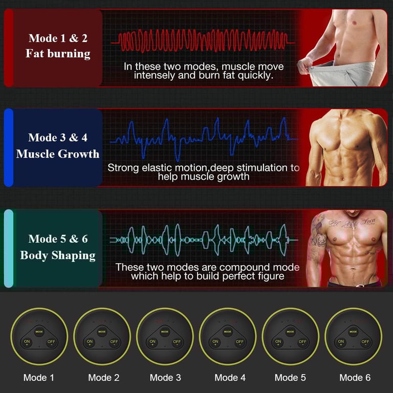 💪【6 MODES & 10 INTENSITY LEVELS】 About 20 minutes (low level 10 mins, medium level 5 mins, high level 5 mins). There are 6 modes and 10 intensity levels optional to help with fat burning and muscle growth. This equates to a 2000m run, 60 minutes of sit-ups, 60 minutes of freestyle, 2 weeks of dieting. The professional muscle stimulator allows comfortable and personalized training at home and in the office.