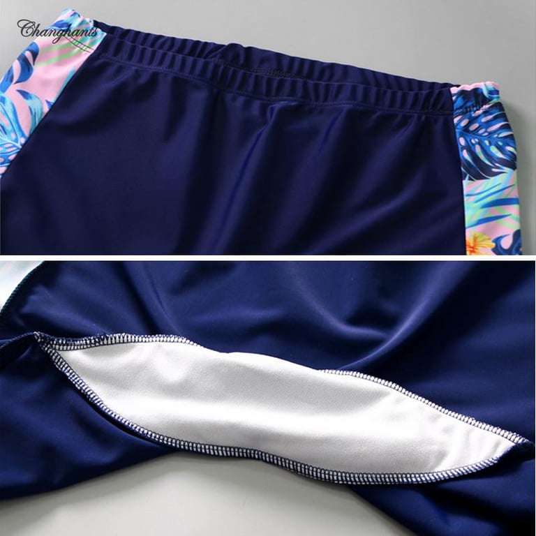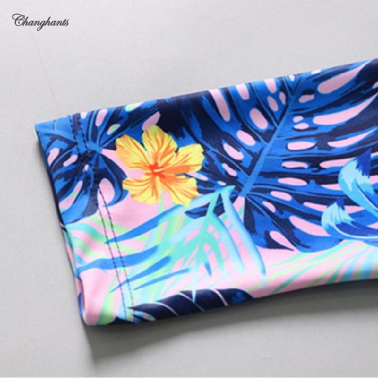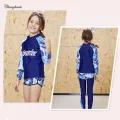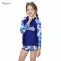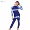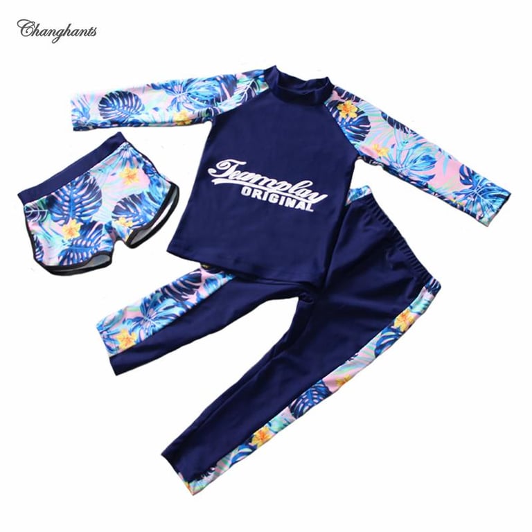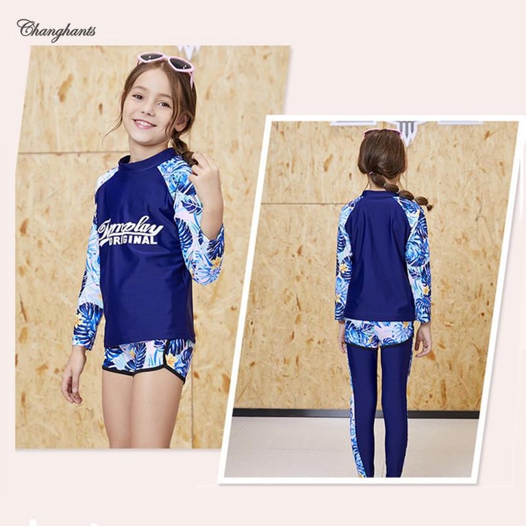 Swimming Outfit for Teens Girl 3 Pieces Set Swimwear for Kids Girls 3-16 Y Long Sleeve Rash Guard for Children 3 In 1 Set Swimsuit for Schoolgirl Deep Blue with Leaves Pattern