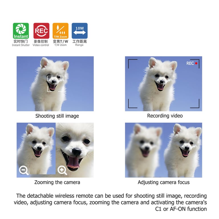 \n\nThe 10m / 32.8' detachable wireless remote replaces Sony RMT-P1BT remote commander, which can be used for shooting still image, recording video, adjusting camera focus, zooming the camera and activating the camera's C1 or AF-ON function