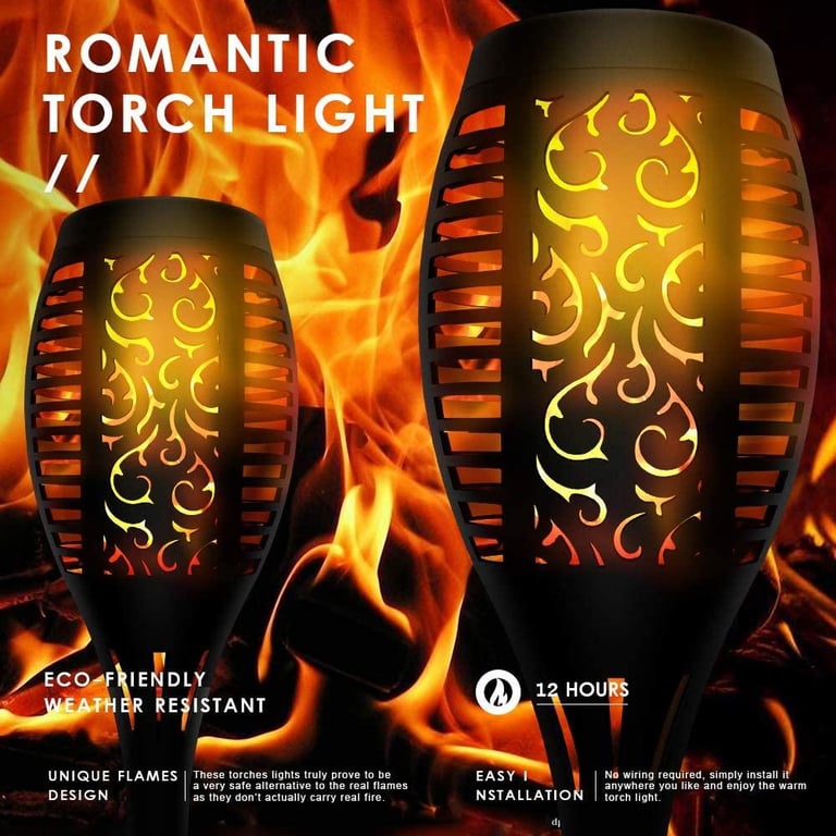 【Solar Powered Flame Lights】Powered by our high efficient solar panel and 2200mAh rechargeable battery. turns on automatically at dawn. Can light up to 12 hours in summer and 5 hours in winter after fully charged.Charging time: 6-8 hours. No oil, no fires, no pollution and no electricity bill.