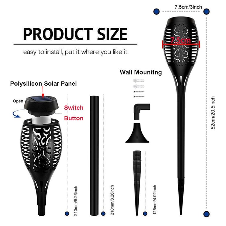 【Dancing Flames Design】 Close to the real “flames”.provides a perfect campfire ambience for your garden party, camping, barbecue, wedding, Christmas, Halloween festival.This is a small torch with the total length of 22.8in, and the width of 2.95in.