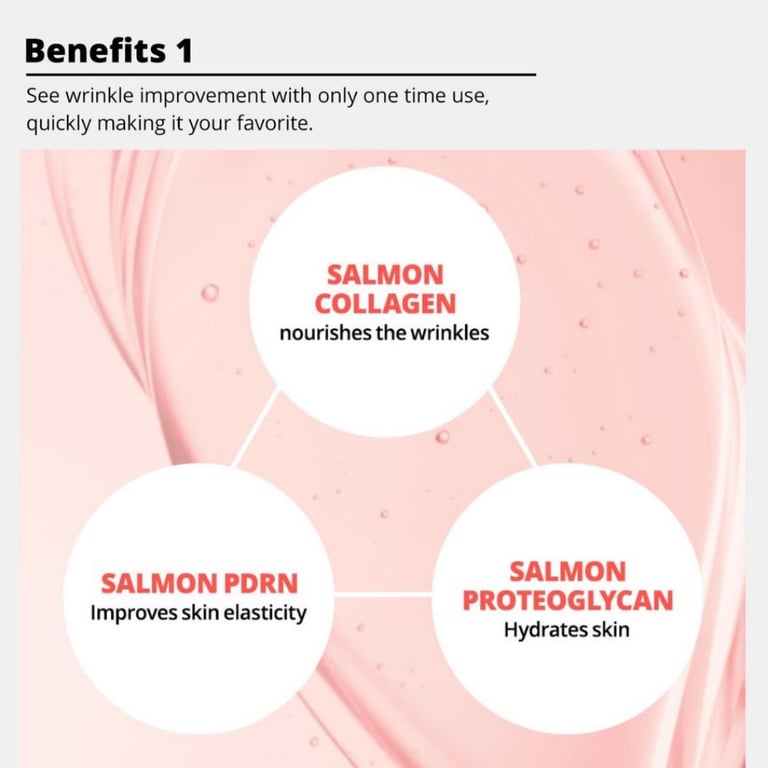 • - Infused with Salmon Complex such as Salmon Collagen and Salmon PDRN, which increases the synthesis of collagen in the skin to restore the elasticity of the skin effectively.
