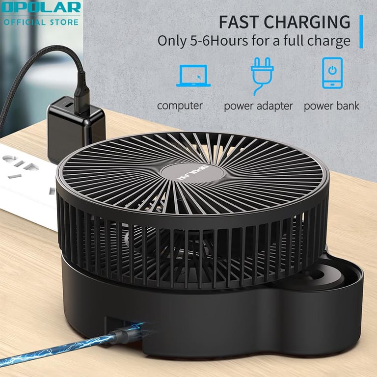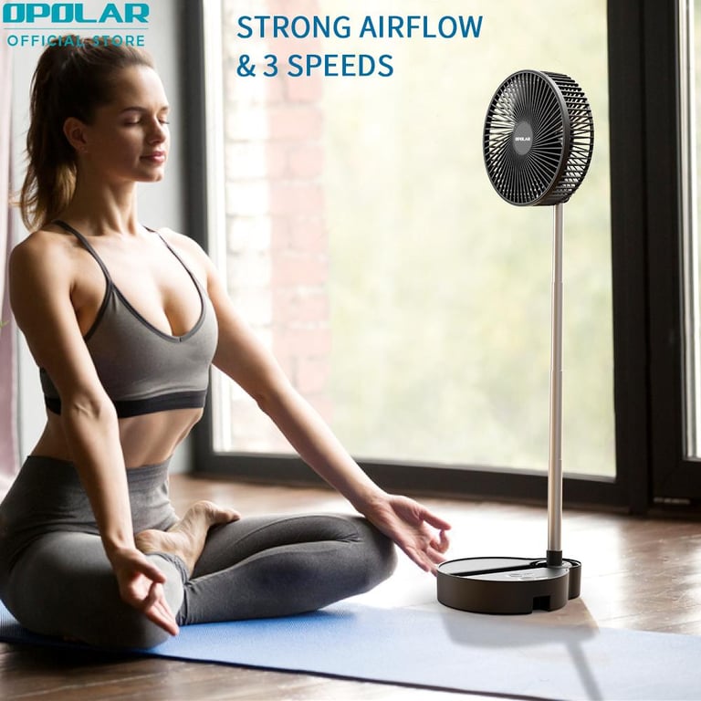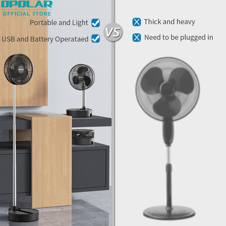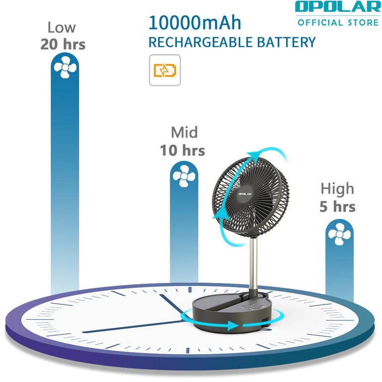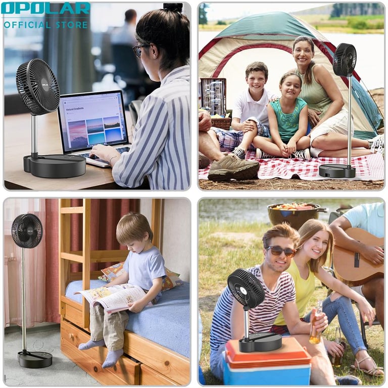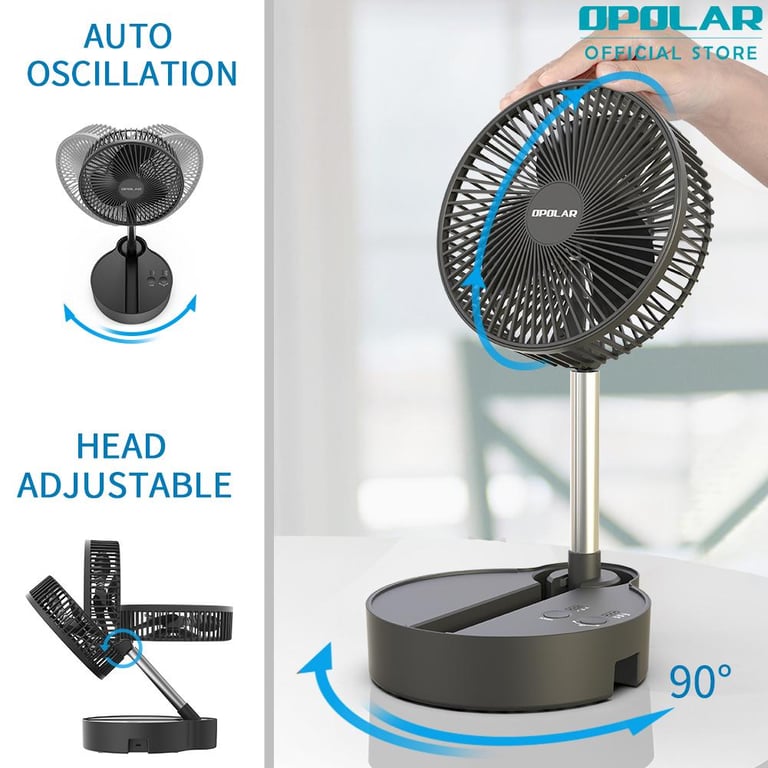 - 【Multifunctional Fan】With unique foldaway & telescopic design, the telescopic fan combined standing fan with desk fan. The foldaway fan can be folded to a small size, you can take in your backpack to everywhere. Meanwhile, the 3 in 1 oscillating fan can save you much money because you needn’t to buy various of fans.【Height Adjustment & Automatic Oscillation】The height of the standing fan can be fully adjusted from 4.3" to 43.7". In addition, the oscillating fan can automatic oscillate 90 degree horizontal and rotate 180 degree vertical, wherever you put it on your desk or the floor, which can make your cool from any angle. 【Largest Battery Capacity】The rechargeable folding fan comes with a 10000mAh battery capacity, which can work 5-20 hours with different speeds. Whatever you sleep or want to go out, you needn’t to worry. The battery operated fan can cool your whole summer. 【Super Quiet with 3 Speeds 】With 3 speed settings of the portable desk fan, the portable folding fan can reach 2.4m/s-4.3m/s, it has a strong airflow. With a upgraded technology, the battery operated standing fan is super silent even if at the largest speed, allow you to enjoy a peaceful sleeping, studying or other important things. 【USB Charging Port】The rechargeable portable fan can be fully charged within 6 hours. The USB standing fan is powered by USB(2A) and compatible with PC/laptop, power bank, AC adapter, car charger, and other USB-enabled power supply.