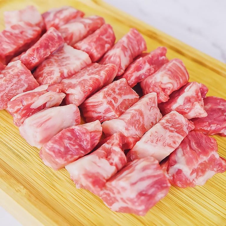 Our Australian Grain-Fed Wagyu beef dice is cut freshly everyday. It has a good marbling with balanced fats and muscles. Best for stewing, grilling and BBQ. It is also known for it’s chewy yet juicy texture and may to have some tendon/muscle present.