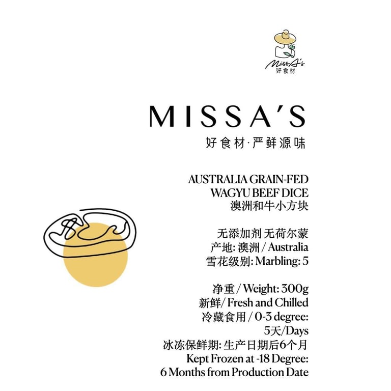 Australia Grain-Fed Wagyu Beef Dice 澳洲和牛小方块 Product Information Our Australian Grain-Fed Wagyu beef dice is cut freshly everyday. It has a good marbling with balanced fats and muscles. Best for stewing, grilling and BBQ. It is also known for it’s chewy yet juicy texture and may to have some tendon/muscle present. 含有丰富及分布均匀的脂肪,可能有部分的筋膜 烹饪时内在油脂的融化赋予肉块极为丰富的风味和香气 保持肉块的鲜嫩多汁 是烹饪的极佳选择。适合烧烤,炖煮等多种烹饪方式。 无添加 无抗生素 无生长激素 自然饲养 产地: 澳洲/ Australia 雪花级别 / Marbling: M5 Grain-Fed 谷饲 净重 / Weight: 300g 冷藏食用 / 0-3 degree: 7 天/Days 冰冻保鲜期: 生产日期后6个月 Kept Frozen at -18 Degree: 6 Months from Production Date Miss A’s Handpick Fine Food Delivery Schedule: (1) Order paid on Monday to Thursday- Before 4pm —> Next day delivery between 4-7pm- After 4pm —> 2 Days later between 4-7pm (2) Order paid on Friday- Before 4pm —> Saturday delivery between 4-7pm- After 4pm —> Monday delivery between 4-7pm (3) Order paid on Saturday & Sunday —> Delivery on Tuesday between 4-7pm (4) Ordered Paid on Public Holiday —> 2 Days later between 4-7pm * Delivery schedule above reflects Earliest Day of Delivery * We will follow the delivery schedule, unless a later date is requested in the remark after order is placed