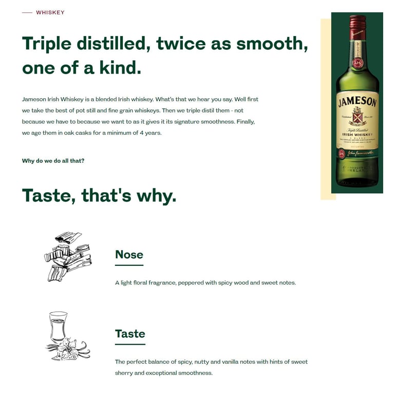 Nose: To the nose, Jameson has a light floral fragrance, peppered with spicy wood and sweet notes.
