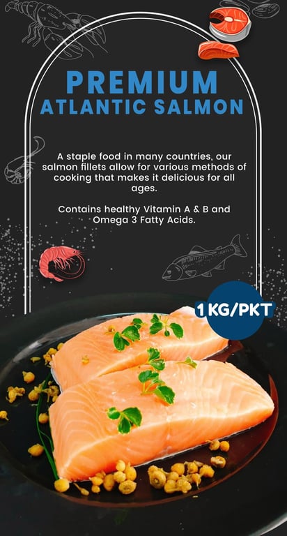 A staple food in many countries, our salmon fillets allow for various methods of cooking that makes it delicious for all ages. Contains healthy Vitamin A & B and Omega 3 Fatty Acids.