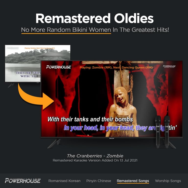 Tired of the random bikini woman MV that you typically see in karaoke studios? Powerhouse Karaoke Systems has re-created thousands of songs with their original MV in HD quality! From The Beatles, The Rolling Stones, to Eagles. We have them in their original MV!