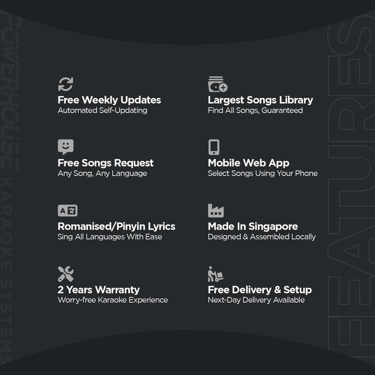 Karaoke system for home is now made affordable with our new "Powerhouse Slim Starter Home Karaoke System"! We have redesigned karaoke system speakers to be just 8cm thick, made specially for Singapore homes. Amazingly slim yet powerful with 450W of superb sound quality for that perfect home karaoke system experience! This karaoke system package comes complete with our flagship "Powerhouse Touchscreen Karaoke System With Songs" or "Powerhouse Jukebox (Non-Touchscreen) Karaoke System With Songs" that includes all your karaoke songs preloaded with free automated weekly songs updates! Enjoy unlimited access to our entire Songs Library of 17 Karaoke Songs Languages. It's time to get a KTV system for your home now!