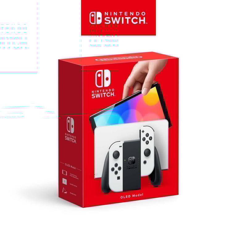 Features white Joy-Con controllers, a black console, and a white dock. Play at home on the TV or on-the-go with a vibrant 7-inch OLED screen with the Nintendo Switch (OLED Model). In addition to the screen with vivid colors and sharp contrast, the Nintendo Switch (OLED Model) includes a wide adjustable stand, a dock with a wired LAN port for TV play, 64 GB of internal storage, and enhanced audio.