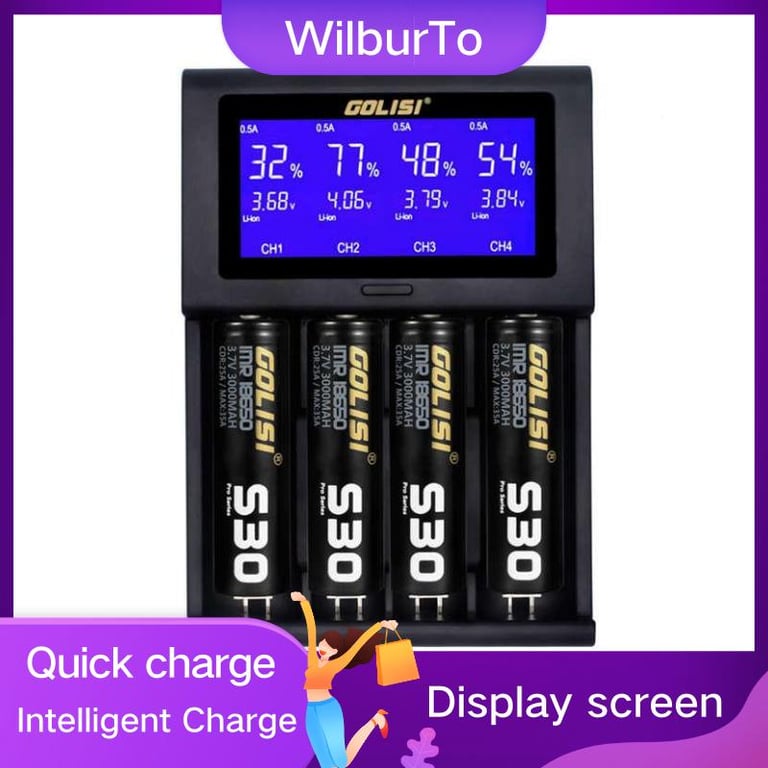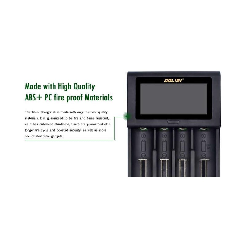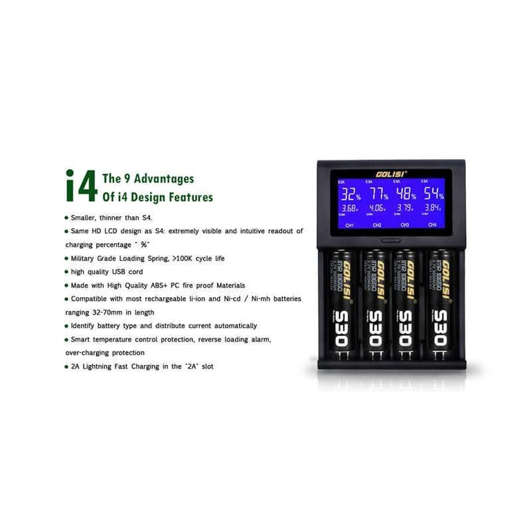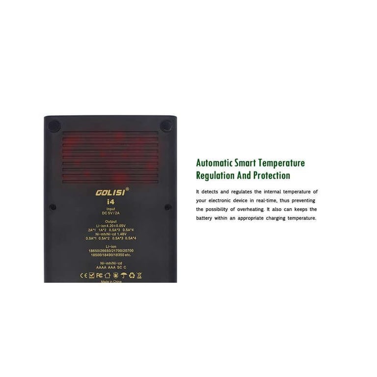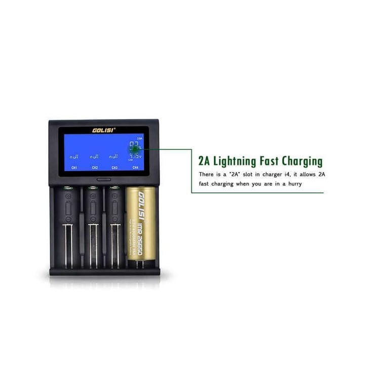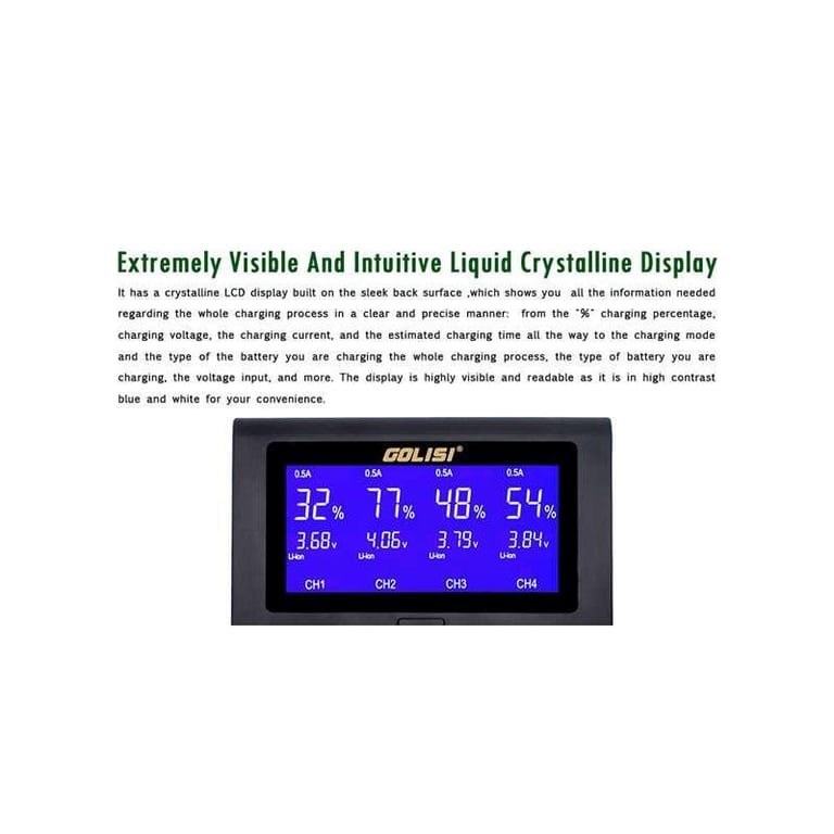 GOLISI i4 is the upgraded version of our star charger S4, it not only inherits the readout friendly on a large HD LCD screen and durable loading springs, i4 adopts USB power port to charge cylindrical rechargeable batteries of length ranging 32-70mm.i4 has 2 core components: a high efficiency Switching-Mode-Power-Supply and a microprocessor. the two parts convert high electricity voltage into suitable voltage for battery charging. The electro-circuit uses 4 independent output charging modes with which it can charge Lithium-ion batteries, Ni-mh batteries, and Ni-cd batteries in any model and capacity. The current is constant mode and current can be distributed automatically to 4 channels.LCD display and Operation:Connecting to power supply without loading batteries, the LCD screen will be bright for 2 seconds then displays "null” which means no batteries being loaded. Charging Status VS Screen Display: loading batteries, the screen displays channel /battery voltage / charging current / capacity rates. "%” flashes while i2 device is charging, "%” increases until 100% which means batteries are fully charged, i2 cease charging.Button Operation: Click the button to check related information of batteries, including voltage / capacity / time.A long click can keep the screen constantly bright.Connecting to Power Supply, without batteries, the screen will be bright for 2 seconds then display "null” which denotes no batteries being loadedCharging Status and Screen Display: loading batteries, the screen will display channel / battery type / battery voltage / charging current / capacity rate. "%” flashes mean the device is charging, I4 cease charging the battery. Button Operation: 3-second long click to turn on or turn off the LCD display. A soft tap displays the batteries' charging status including voltage / capacity / timeBrand Name:GolisiType:ElectricQuick charge:YesIntelligent Charge:YesDisplay screen:Yes