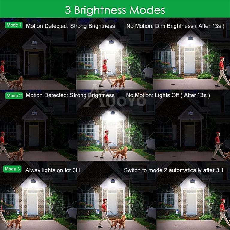 - Three Lighting Modes: 3 modes to meet your different needs: Motion sensor mode, Strong long light mode, Strong light sensor mode. The powerful sensor provides powerful motion sensitivity up to 0-6m, providing convenience and safety for your life.