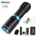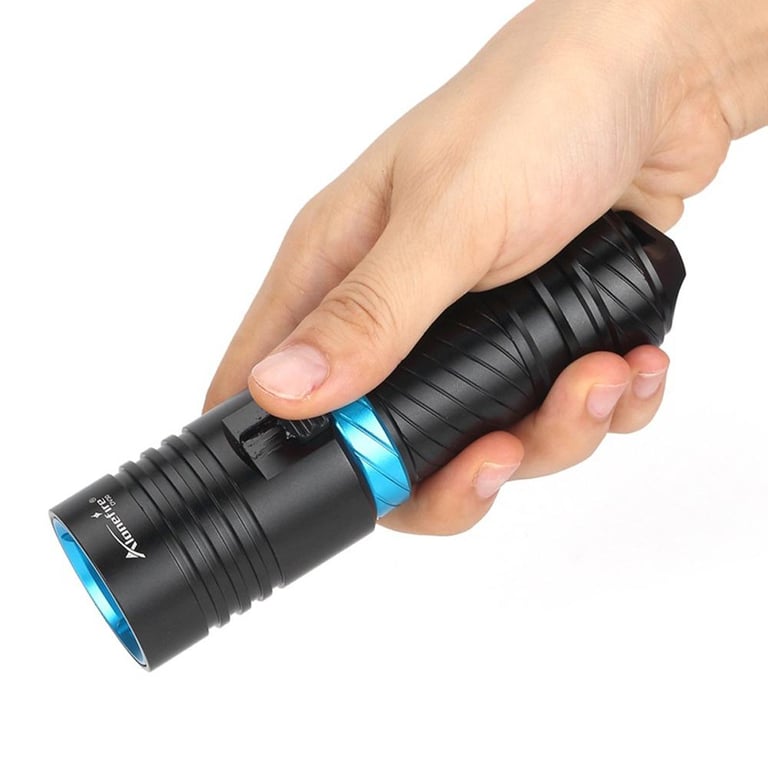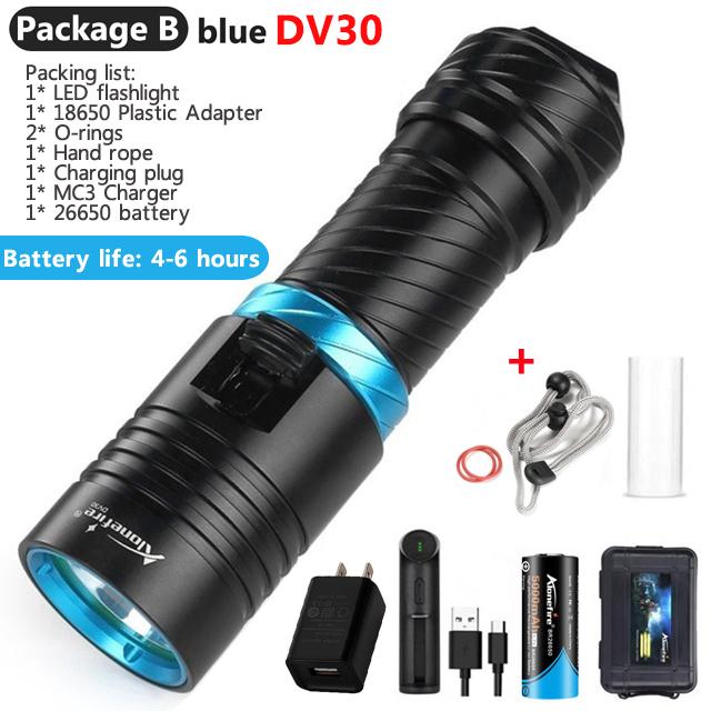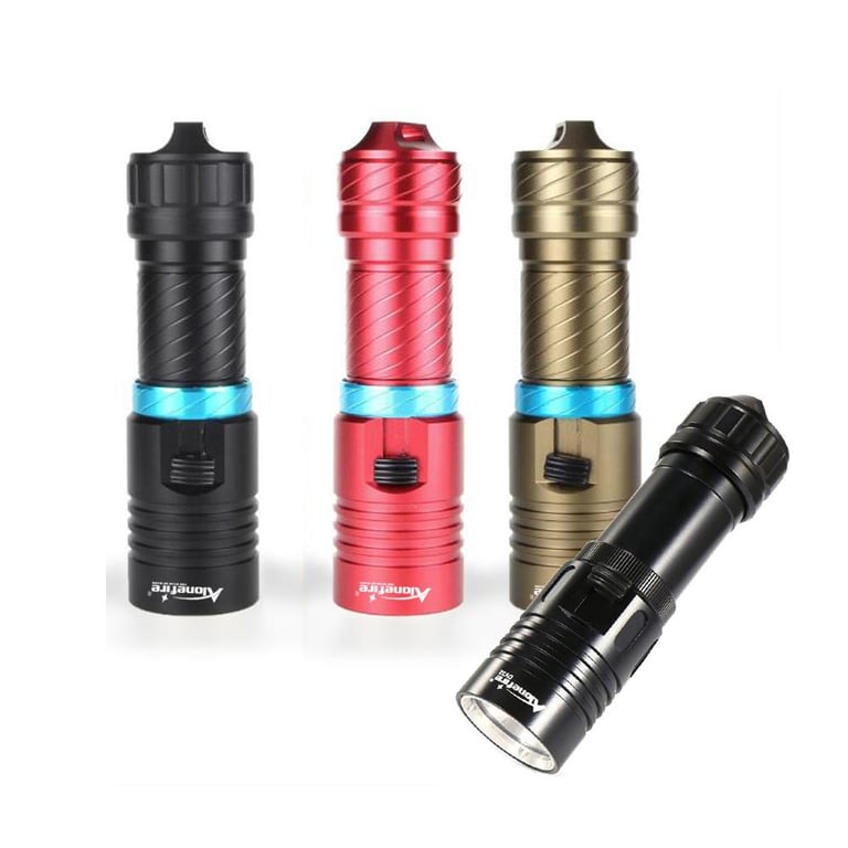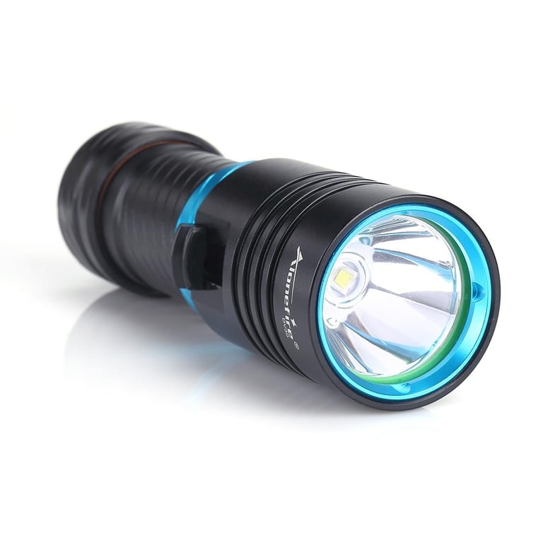 New Diving Dive Light Torch\n\nBulb: XM-L2 LED\n\nEmitting Color: white\n\nThe latest L2 LED provides greater light intensity and uniformity compared to conventional T5/T6 or U2 LED lamps!\n\nLED life: 100,000 hours\n\nMade of high quality anodized aluminum alloy extremely scratch-proof and corrosion resistant\n\nCan accommodate up to 100 meters water depth diving\n\nIntegrated cool surface on the lamp head ensures low heat in spite of high performance\n\nAdjustable light intensity under water operated\n\nContinuously changing light intensity by slightly moving the switch\n\nSealed waterproof design\n\nDurable, double-lubricated O-ring seals provides double security to function under water\n\n3-optically tuned mirror reflector for optimal light output\n\nPowered by 1 x 3.7V 18650/26650 Batterys(26650 battery include)\n\nSize(mm): 135 x 36\n\nWeight : 166g/430g\n\nBest suited for: Diving, camping, hiking, trekking, hunting, fishing ...