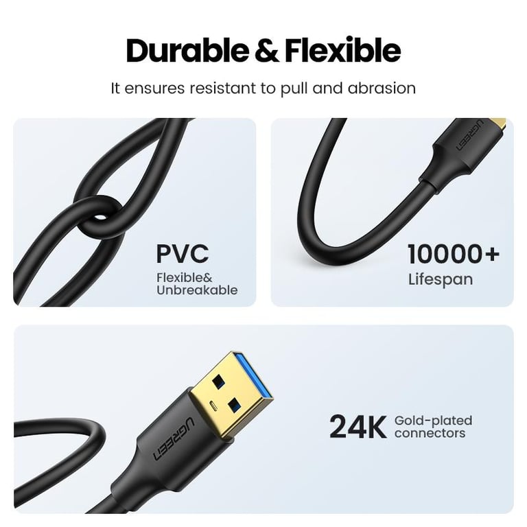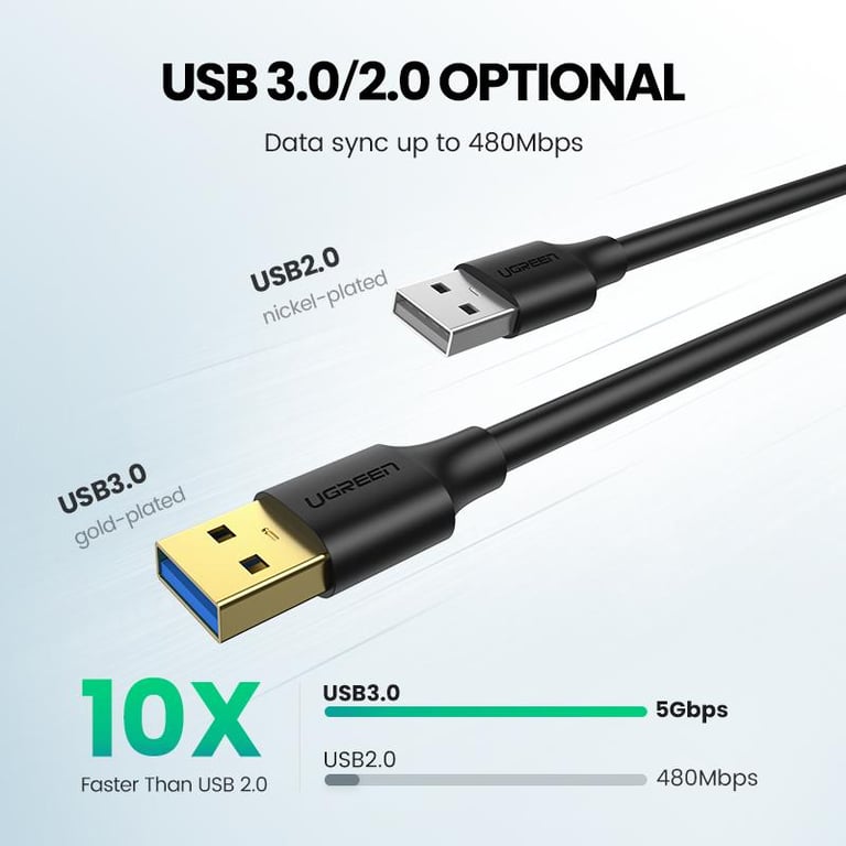 - High speed:UGREEN USB 3.0 cable allows you to transfer data up to a speed of 5Gbps, 10 times faster than USB 2.0.Backward compatible with USB 2.0 full speed (480Mbps) / USB 1.1 (12Mbps).