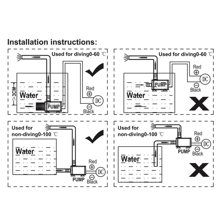 2. Please cut off the power before you install/put in/take away the pump from the water; otherwise, the pump can't outlet water due to the air in it. 3. It can be used in the water or other liquids(without particles and impurities); NOT for viscous and acid-base liquids.