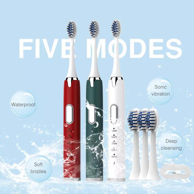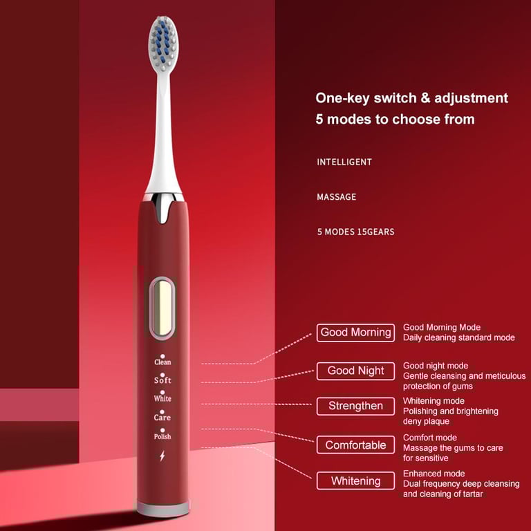 >>Function Mode:1. Good morning daily cleaning mode, recommended for the first use2. Good night gentle cleansing mode, refreshing deep cleansing3. Strengthen the whitening mode, the toothbrush drives the frequency of the bristles to vibrate by changing the motor output frequency to achieve the whitening effect4. Comfort mode, care for sensitive teeth5. Sensitive mode, cleans tartar, suitable for sensitive teeth, indirect switching vibration frequency can effectively relieve