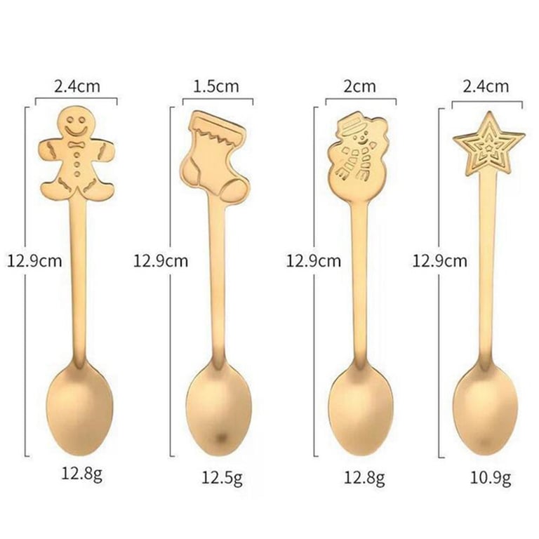 Features: Stainless Steel Material, Easy to Clean. Professional kids spoon. Applicable for Children and Lovers to use.The special gift at home. Sugar Coffee Tea Ice Cream Desserts Tasting Spoons. Specification: Type: Christmas Spoons Material: Stainless Steel Size: 12.8*2.3cm Color: As pictures shown Package included: 4pcs/set Spoon(color box)
