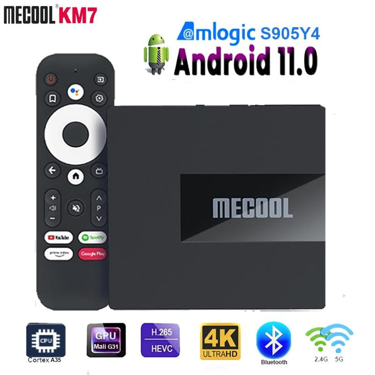 Mecool KM7 Android 11 TV Box Amlogic S905Y4 Quad Core Cortex A35 4K 2.4G&5G Wifi Bluetooth AV1 2G 4G 16G 64G 100M Smart Media Player Support Voice Assistant Set Top Box